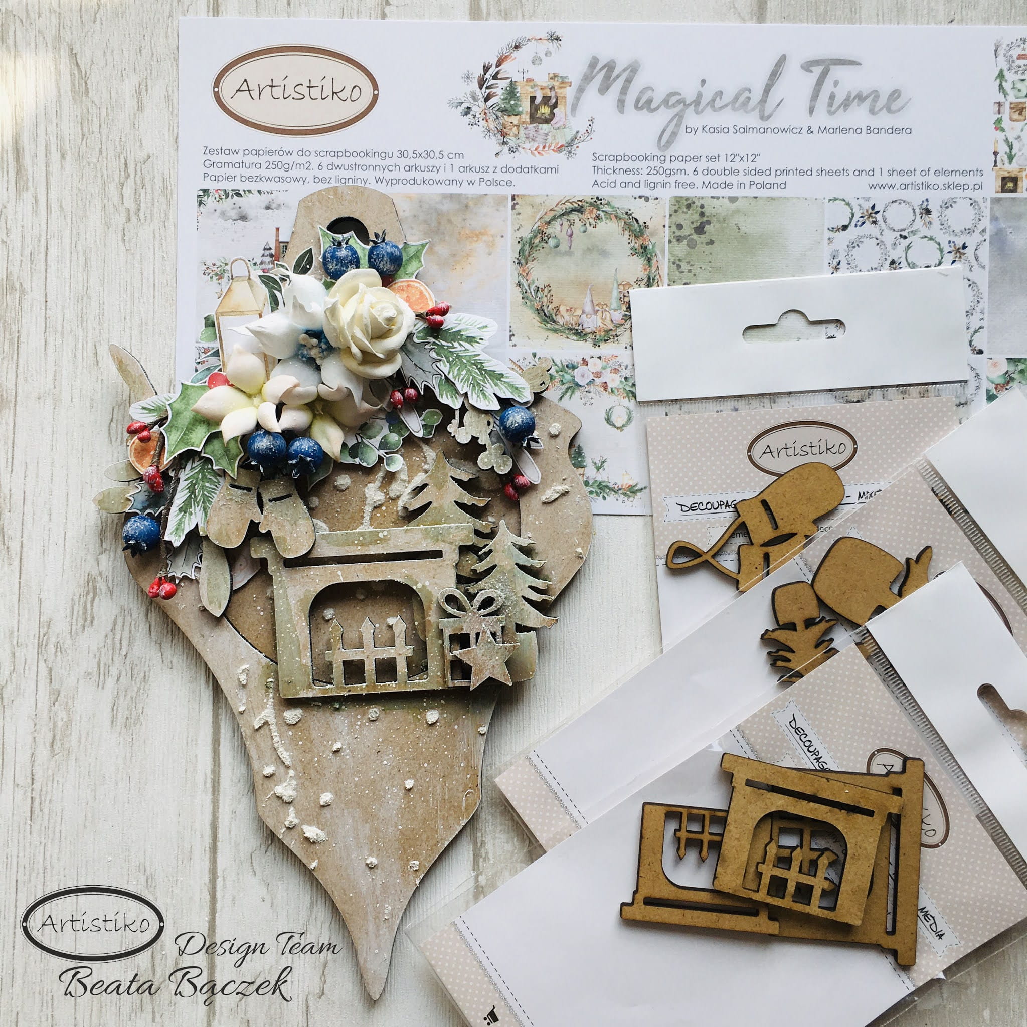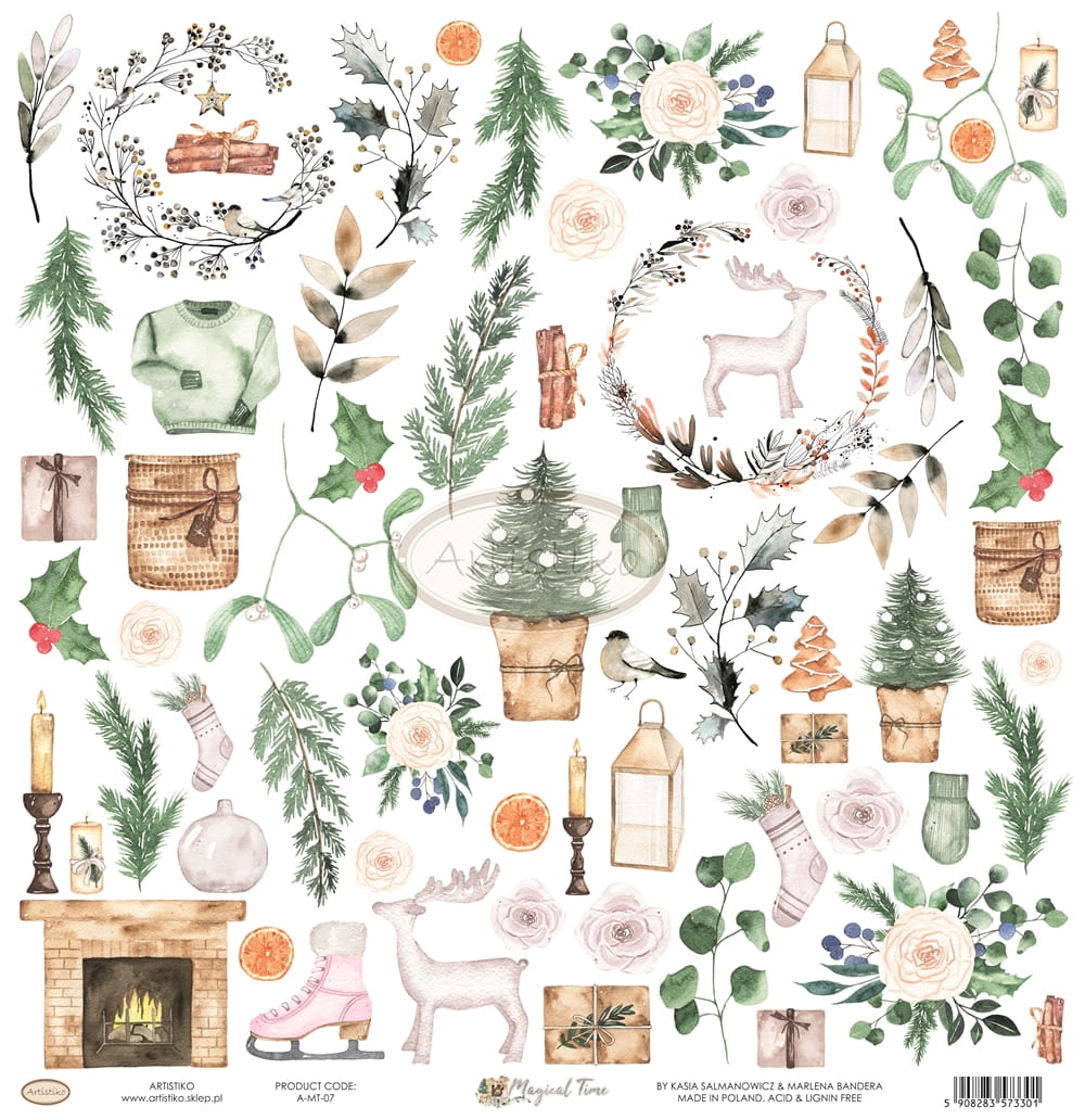 Magical time wprowadza nas w niesamowity klimat świąt Bożego Narodzenia. Delikatne zestawienie barw, dzięki którym stworzysz wiele niepowtarzalnych projektów. Odcienie szarości łączą się z nutą brązu i błękitu, a wszystko to wzbogaca spokojny odcień zieleni. Arkusze z klimatycznymi kompozycjami, wianuszki, karty i elementy do wycinania, do tego akwarelowe tła w połączeniu z fakturą tkaniny.